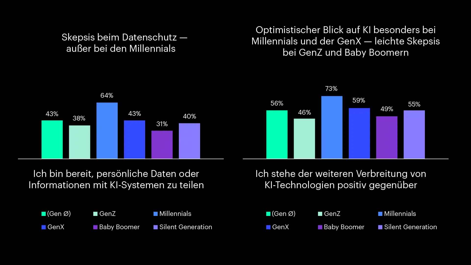 Noch krasser die Ergebnisse bei der Projektionsfrage für die Zukunft. Mit 73% Zustimmung blicken die Millennials in eine rosarote KI-Zukunft. Und hier sind GenX und Baby Boomer noch deutlich optimistischer als die ganz Jungen. Nicht einmal jeder Zweite aus der GenZ (46%) steht der weiteren Verbreitung der KI positiv gegenüber. Hier zeigt sich konsequent bestätigt, was sich auch in anderen generationsspezifischen Befragungen zeigt. Das Pendel schwingt zurück: Mit der GenZ ist nach den Millennials eine Generation herangewachsen, die in vielen Werte-, Einstellungs- und Verhaltensfragen nicht eine Fortsetzung, sondern geradezu das Gegenteil ihrer Vor-Generation denkt und tut.